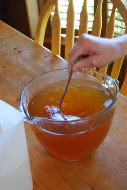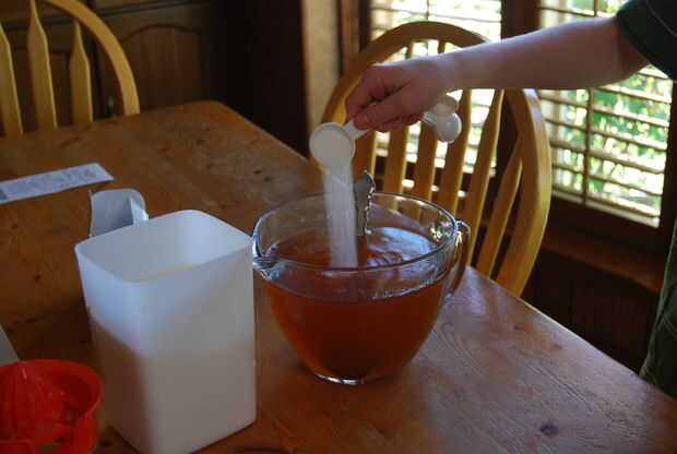Jejeje!' Luego, vierta el jugo de limón en la jarra con el té. Revuelva con la cuchara grande. A continuación, sacar su "handy dandy" cucharas dosificadoras y vierta 5-6 cucharadas de azúcar, uno a la vez. Cada vez que usted vierte en, revuelva hasta que se disuelva, que debería ser bastante rápido ya que el té esté todavía ligeramente caliente.