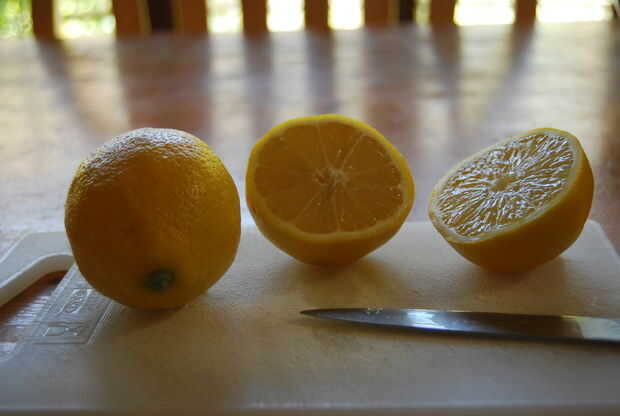 Una vez que el té se ha enfriado, verter en la Jarra medidora grande. Cortar el limón por la mitad y