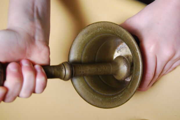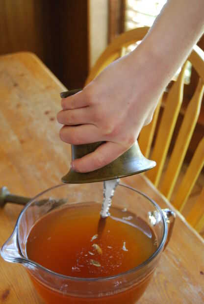 Una vez que haya terminado el paso 3, su mortero y pestel y machacar encima de semilla de una cardamomo. Convierten en polvo. Luego viértala en la jarra y mezcla; no te preocupes si está flotando alrededor, el siguiente paso ahorrará usted...! ....