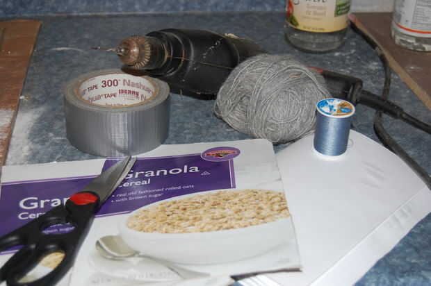 1. cartón (yo usé de viejas cajas de cereales) 2. cinta 3. tijeras 4. papel (yo usé aproximadamente 50 páginas) 5. un taladro con una broca pequeña 6. cadena o hilo de rosca