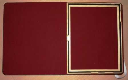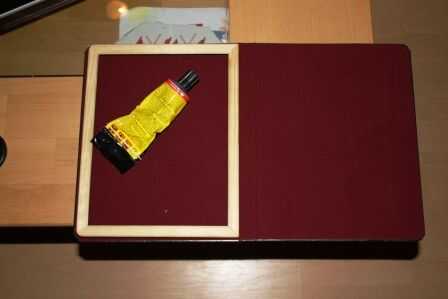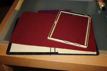 2. Coloque el interior forro para la tapa. Este paso debe realmente llevarse a cabo cuidadosamente. Cualquier extravío del trazador de líneas interno inmediatamente será visible (porque tiene líneas paralelas desde el forro interior a los bordes exteriores de la caja). Una vez más, como con la alineación exterior, asegúrese de quitar todas las burbujas. Esta vez siendo muy cuidadoso debido a la superficie de gamuza.