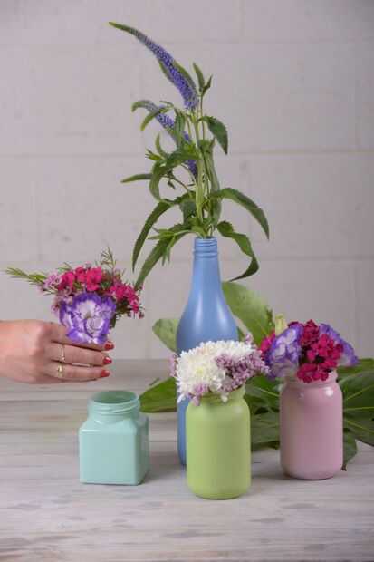 A continuación, podemos poner las dos partes juntos poniendo su hermoso ramo mini en uno de sus frascos recién pintadas. Tenga cuidado de comprobar que la pintura haya secado antes de hacer esto para evitar cualquier riesgo de cubrir sus flores en la pintura. Ser suave como pones las flores en la jarra con el fin de mantenerlos en las mejores condiciones posibles.