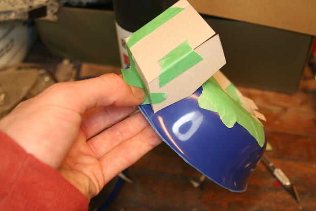 Ahora tenemos que hacer una ventana para el incorporado-en flash entrar en el adaptador. Corte una ventana en el lado del tazón de fuente un poco más grande que el tamaño de la flash de la cámara. Utilice el cartón extra para crear un canal para la luz. Debe tener un ángulo de 45 grados para reflejar la luz recta que viene por abajo en el flash de anillo. Luego cubrir el interior con cinta más reflexiva y adjuntarlo a la taza.