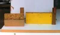 Dos de las plantillas se muestran aquí en la foto de la espalda y la parte delantera. En la vista izquierda, tira horizontal de madera contrachapada se coloca contra la parte inferior de la vigueta. La superficie horizontal superior localiza la franja del espaciador.