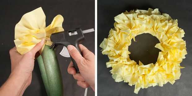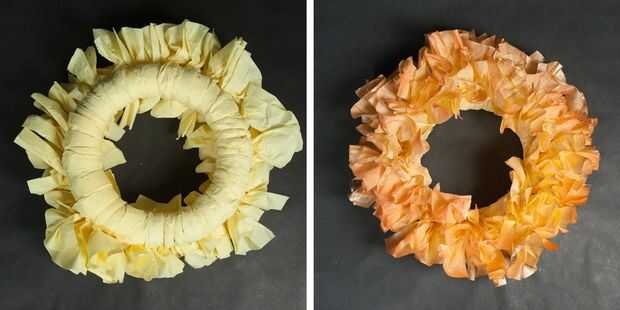 Seguir añadiendo a su corona, repitiendo todo el proceso con el resto de la pila de la servilleta hasta cubre completamente la base de la guirnalda. Utilizar el esmalte claro de Krylon para cubrir completamente su guirnalda terminada, dando a la nave una textura rígida que lo mantendrá en su lugar. El equipo de Venta por mayor fiesta recomienda esperar al menos 30 minutos antes de utilizar la pintura en aerosol naranja para cubrir ligeramente la servilleta. Desde allí puede utilizar la pintura de aerosol metálica oro para añadir un brillo a los bordes de la decoración colgante.