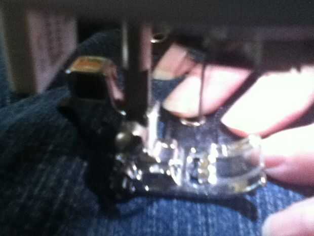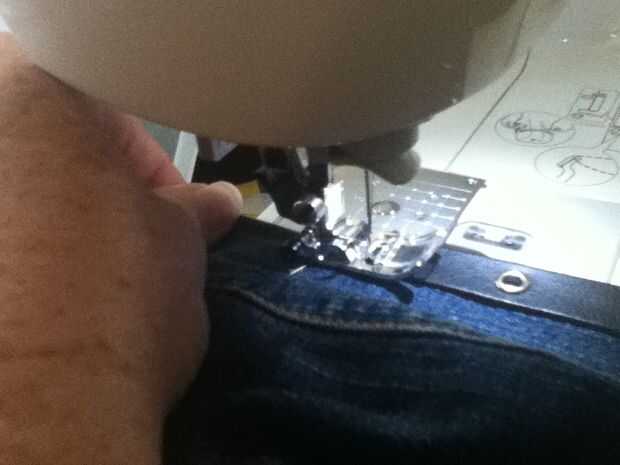 Esta parte es un poco tediosa, cuidadosamente la parte superior de la mitad de la cinta en su máquina y zig zag de la puntada para garantizar. repetición en la parte inferior de la cinta y luego otra vez en la otra pierna. Tenga cuidado de no coser por la parte trasera de los jeans. Tendrá algunas maniobras para sacarlos de la máquina y puede que necesite manojo de algo. Si lo desea también puede entregar puntada.