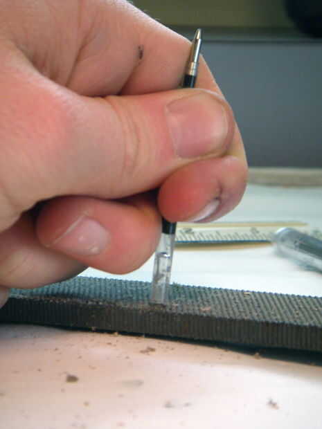 * Poner el archivo en la tabla y moler el extremo del palo. Es necesario deshacerse de unos 3 mm de longitud.
