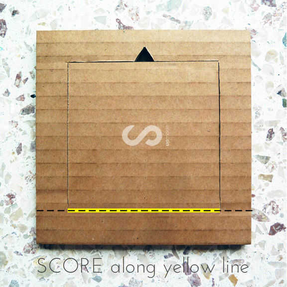+ Usar su regla y utilidad cuchillo puntuación a lo largo de la línea para completar el cuadrado, cortando sólo la capa superior de la tarjeta (*** la clave está en no cortar completamente el cartón ***)