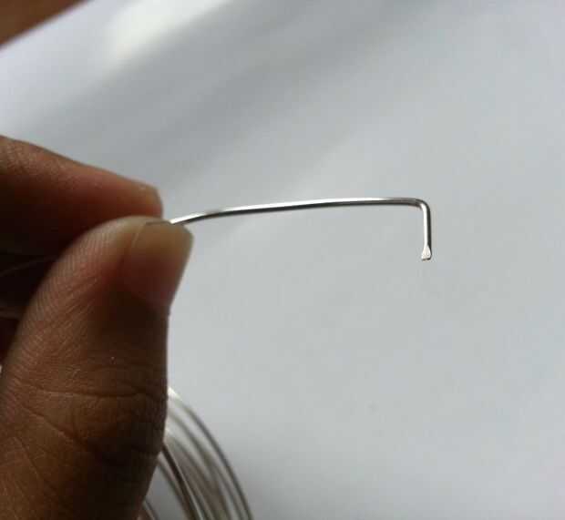 Utilice los alicates de punta plana para doblar el alambre a 90 grados, según el tamaño de grano. He utilizado bolas de perla 8 mm así que tuve que doblar alambre de 8 mm a 90 grados.