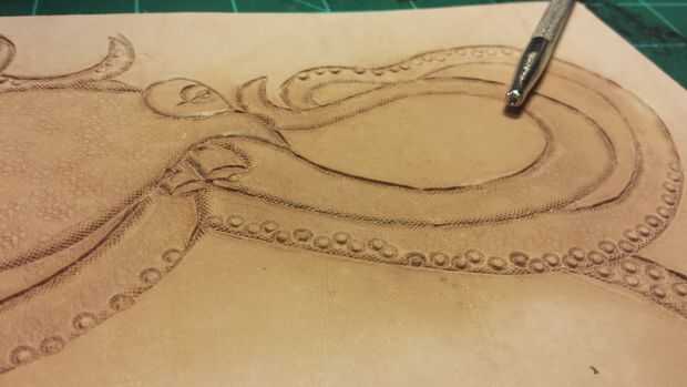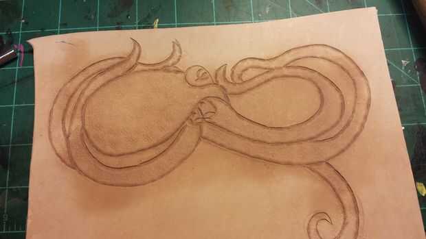 Forma cortado y fileteado diseño en cuero. Entonces perfora orificios para sutura bolsaPaso 1: Diseño de morirYo pintando un tinte a base de agua para dar mi tentáculo algunos color y dimensión.Paso 2: Morir bolsaHabía teñido de marrón muy oscuro, as