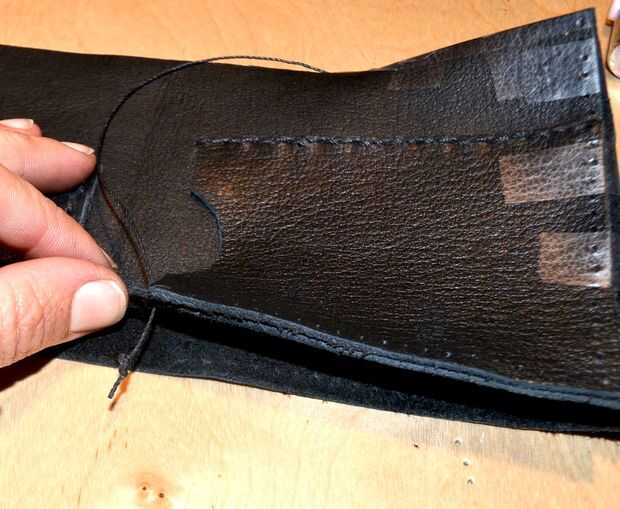 Hacer un triple nudo en el hilo y dejar el nudo en el interior de la cartera.