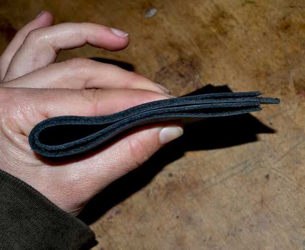 Junte las dos piezas grandes, doblar por la mitad y cortar la pieza de cuero que sobresalen de la pieza central de cuero.