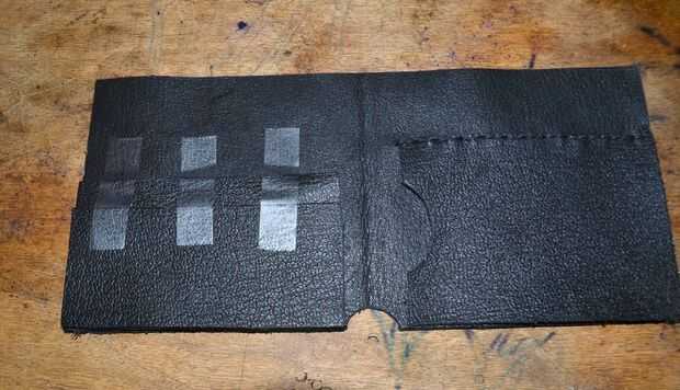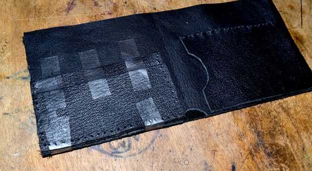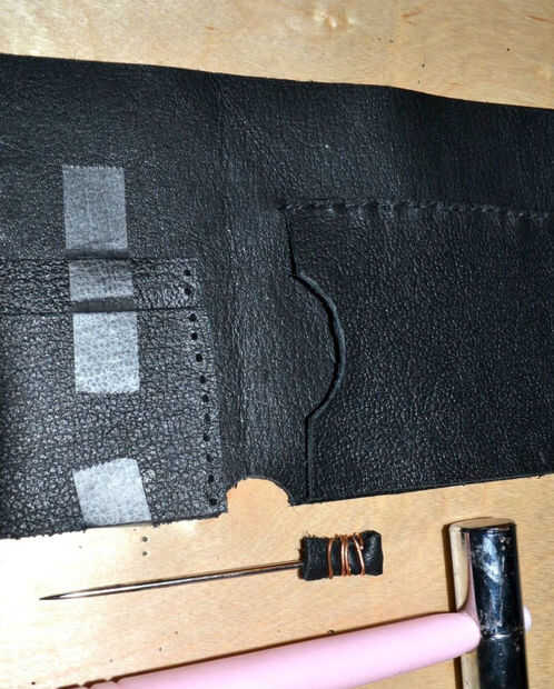 Lugar también la parte de cuero principal fuera de la cartera y hacer más agujeros en la parte inferior de los tarjeteros y el lado izquierdo, hasta la parte superior de la cartera.