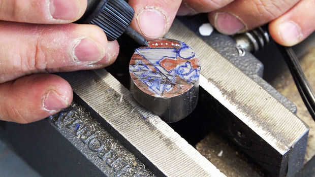 Estoy usando acero 1018, por lo que yo puedo trazar el contorno con un cuchillo del exacto cuya hoja es generalmente acero inoxidable 440. 440 es más difícil que 1018. Luego usé un grabador eléctrico para poner pequeños agujeros alrededor del diseño para que cuando perfore el espacio negativo mi broca quedará puesto. El rojo en la foto es el espacio negativo.
