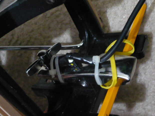 He utilizado tres pequeñas abrazaderas de plástico que se pueden obtener casi en cualquier lugar, tengo dos paquetes de estos de shack de radio el verano pasado para alrededor $2 cada uno. Hacer 2 de los lazos del cierre relámpago en los lazos y luego Envuelva el tercero alrededor del poste pedal y luego a través de las dos abrazaderas de plástico. entonces, simplemente poner la caña cambiar dentro de ellos y apretar y ahí ya ir, su adjunto! Ver la imagen para una mejor idea de lo que quiero decir...