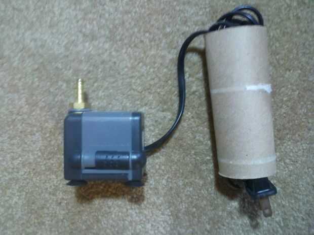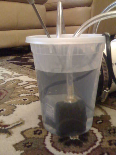 Se encuentra un pequeño cubo para actuar como el depósito de agua. Vas a tener que jimmy la plataforma uno por algunos agujeros para encajar los tubos de vinilo. He utilizado un envase de comida china.