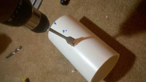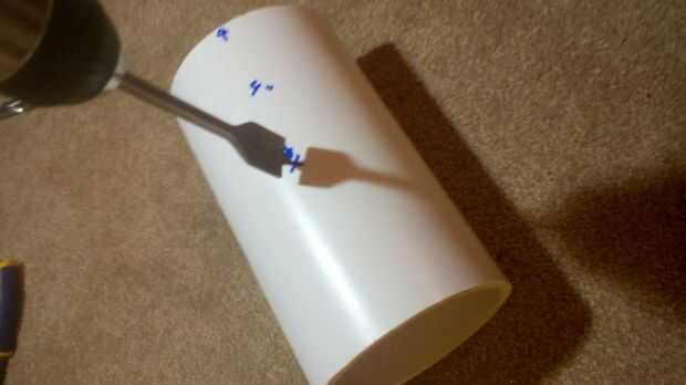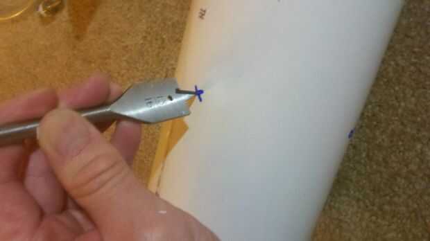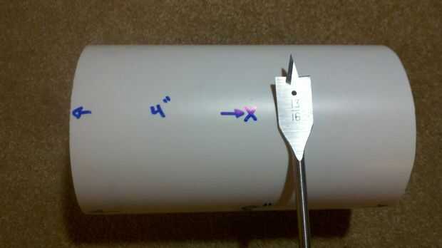 1. Marque 4" desde el borde con una X. Esto es donde perfore un orificio de 13/16" para ajustar la varilla de latón. Es mejor marcar el agujero central para ambos lados porque si usted sólo perforar directamente, se corre el riesgo de tener una barra de cobre amarillo inclinado.