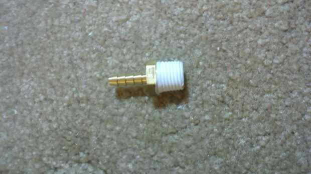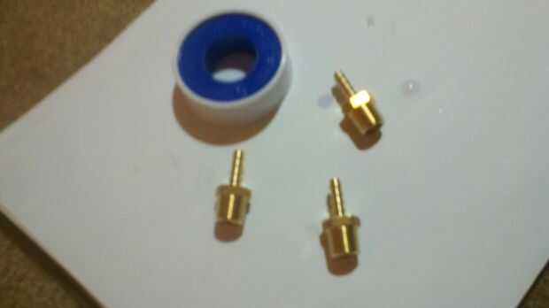 Tomar los tres 3/16" Barb x 1/4 MIP y envolver todo con cinta de teflón. 2 los empalmes de varilla de latón y 1 al agujero vacío.