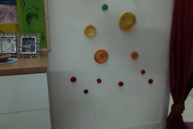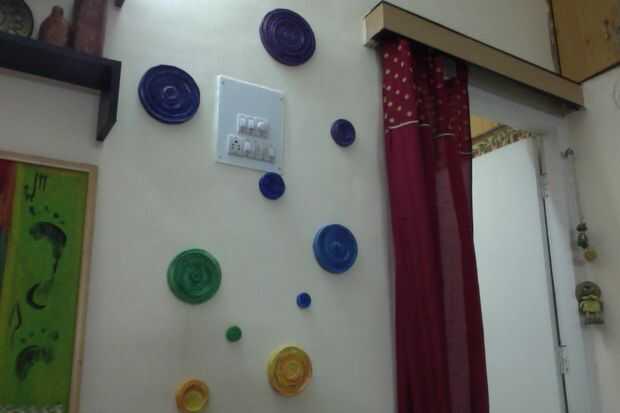 Pegan los discos periódico coloreado sobre la superficie con el adhesivo. Usé pegamento de fácil flujo blanco de Fevicol porque funciona mejor en casi todas las superficies y está disponible en casi todas partes la India.