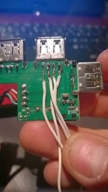 Ahora, estos cuatro cables los soldaremos un una de las salidas de nuestro centro. Casi 100% vuestro cubo sí una entrada tipo USB A Device. Lo más cómodo es soldar los cables del elementos por donde se destacan el USB, el estaño ya está ahí y con un poco más de material lo soldareis pecado problemas.