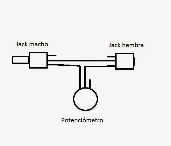 ¿Quizás algunos pensaréis, porque no soldar directamente los cables a la tarjeta de sonido y así evitarnos soldar un gato macho? Idea de esta fué mi primera, pero quizás por ser muy malo soldando o por dejar el conector vacío, no conseguí sonara decentemente. Así compré los jack machos y se acabó el problema. Ahora queda el turno a la salida de auriculares luego colocaremos en la parte delantera (o donde queráis, personalmente en la parte delantera es donde es más cómodo) junto al potenciómetro nos dará el volumen de los auriculares. Al poner un potenciómetro de tres pinos, perderemos el estéreo. Buscado potenciómetros de seis pines, pero son muy grandes y no caben dentro de la tabla. ¿Pasa al no ser estéreo? No nos asustemos, podremos hacer la preescucha por los dos auriculares perfectamente y con la misma calidad de sonido que con equipo de música, no solo tendremos control sobre cada auricular por frente. Aunque como lo queremos es no solo la preescucha habrá ningún problema. Primero soldaremos dos cables en la salida machista, el de un canal y el de tierra. El canal es indiferente. Luego el cable de tierra lo soldaremos al conector tierra del jack hembra. El otro cable, el del canal irá soldado a un perno del extremo del potenciómetro, es indiferente cual, y desde el pin del medio del potenciómetro, soldaremos otro cable vaya a un canal del gato hembra. ¿Veis lo hemos hecho? solamente cortamos el cable del canal y lo soldamos al potenciómetro. Una imagen vale más mil palabras.