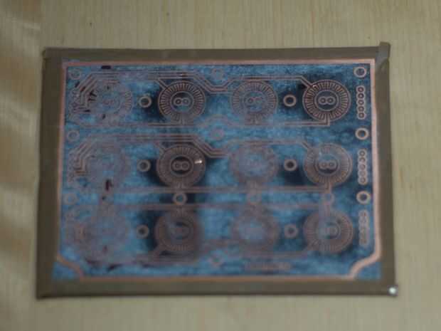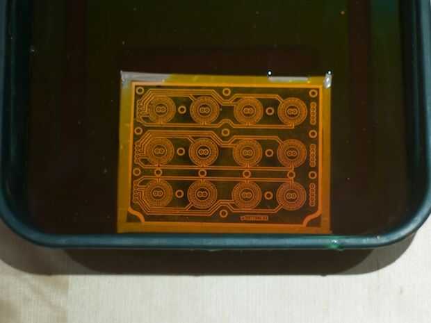 Ahora es el momento para grabar; Puedes conseguir bolas de cloruro férrico y mezclar con agua caliente en su plato de bandeja cristal grabado. Coloque la cara de junta hasta en la solución y la bandeja hacia adelante y hacia atrás, siempre manteniendo el líquido en la parte superior de la roca. Esto podría tomar algún tiempo dependiendo de la mezcla, pero podrás decir cuando el cobre ha sido erosionado totalmente y se puede ver la fibra de vidrio abajo.
