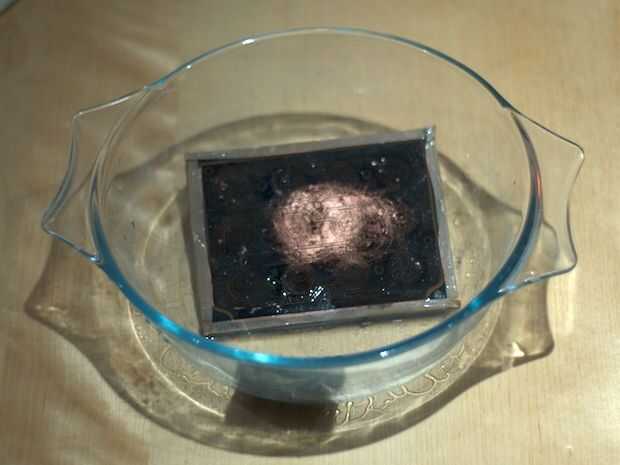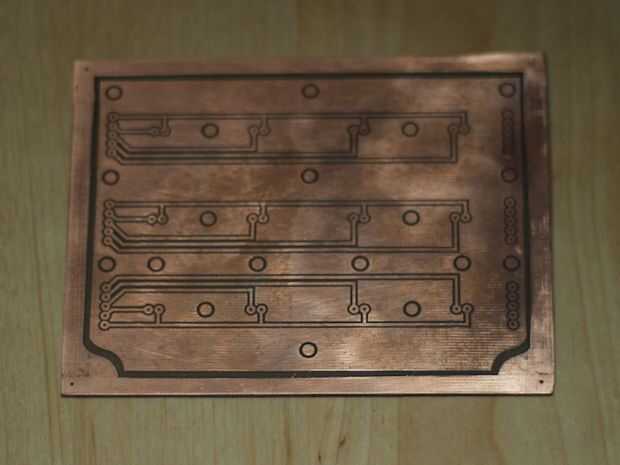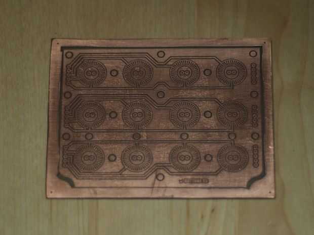 Un lado eso es hecho, si usted quiere el otro tendrá que limpiar la parte de atrás lo mismo que la etapa 2, luego que los gráficos con un alfiler o broca, lo guía en su lugar usando los agujeros de alineación. Este lado igual como etapa 3, no olvides cubrir el lado que ya se ha grabado en cinta marrón (como los agujeros de alineación) y luego empezar de nuevo proceso de producción de la etapa 4 del hierro.