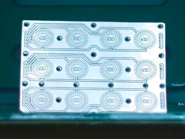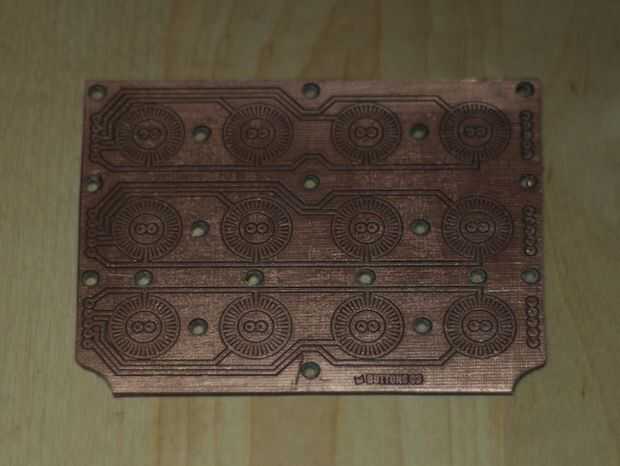 Taladrar todos los agujeros del cable LED con una broca de 0.8mm y los orificios con broca de M3. Entonces usando el disco de corte corte la tabla a la forma y acabó con los bits de curvados con un poco lijado tubular.