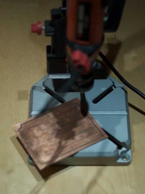 Ahora necesitará taladrar todos los agujeros en el tablero. Te sugiero conseguir un accesorio de taladro para la dremel para hacer esto, aunque estoy seguro de que podía hacerlo bien con una mano firme y un poco de paciencia.