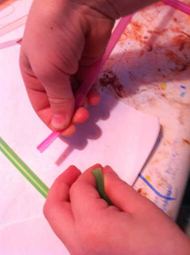La mejor manera que encontramos para unir las cañitas era aplastar un extremo plano contra una superficie dura con nuestros pulgares. Luego poner un pliegue hacia abajo en el centro de la punta plana con un cuchillo de mantequilla. Pellizcando el pliegue juntos, deslice el extremo pequeño en el extremo largo de la paja del otro, como un brazo en una manga.