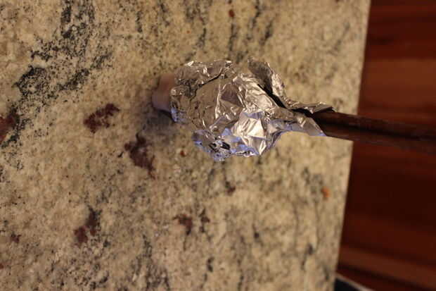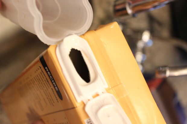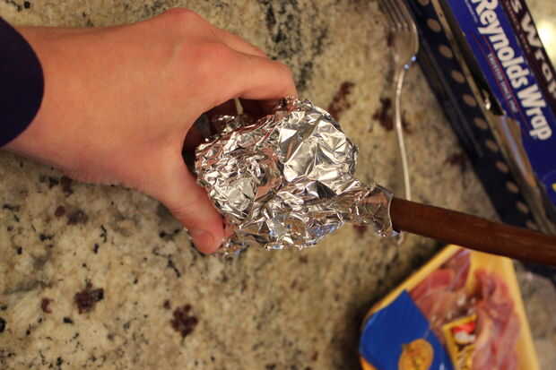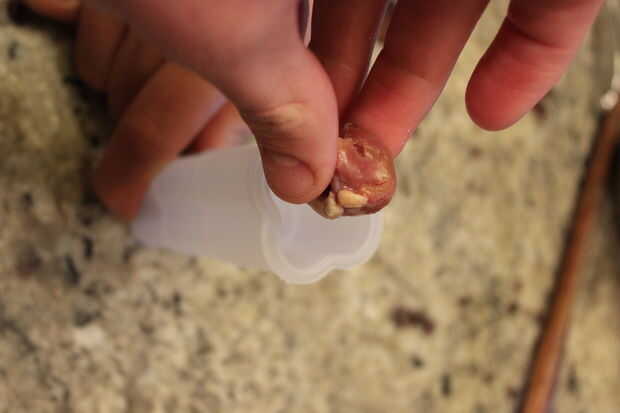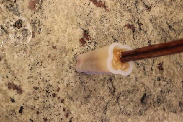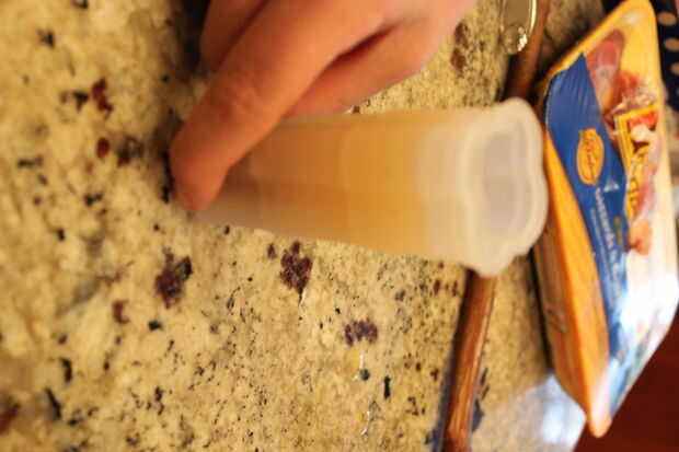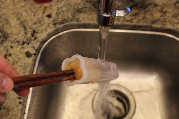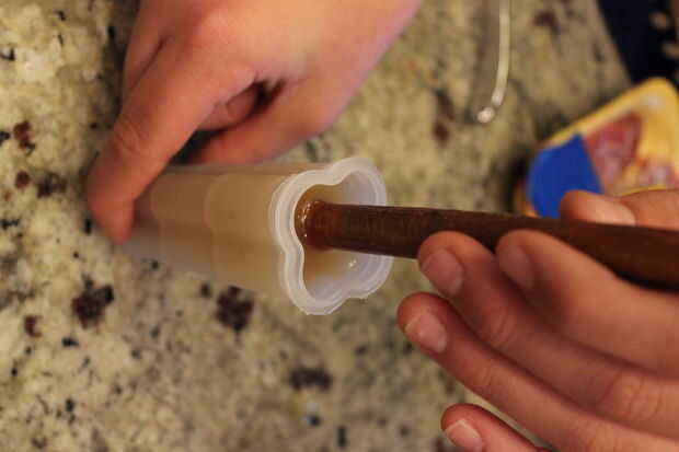 Llenarlo con caldo de pollo, coloque el palo de matón en el molde, fije la parte superior del molde y poner en el congelador.