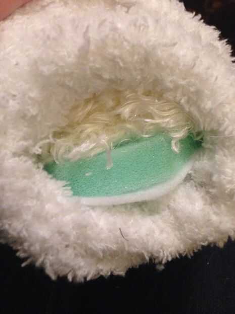 4. Convertir el calcetín derecho lado- y añadir relleno a la parte superior para crear el hocico. He utilizado un trozo de espuma, con algunos trozos de piel. El relleno va en la parte superior del calcetín y la mano del titiritero va debajo.