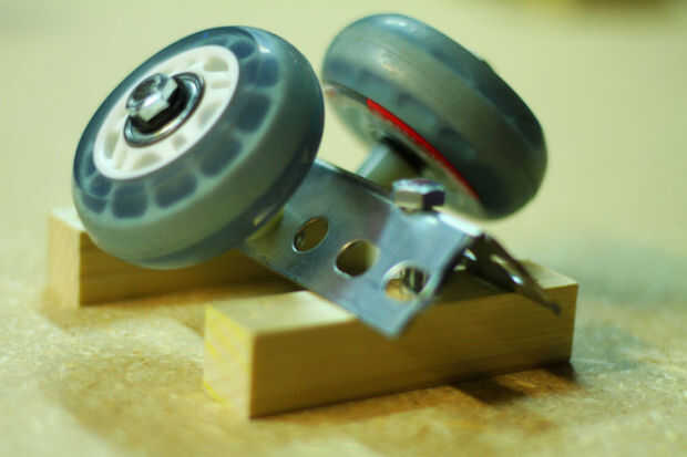 Usando dos pernos hexagonales y arandelas, aseguró los soportes en L en dos lugares por rueda para evitar resbalones y desvío de la rueda.  Tenga mucho cuidado al taladrar agujeros piloto y apretando para evitar doblar el soporte en L y la creación de una superficie desigual.