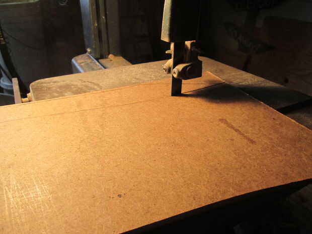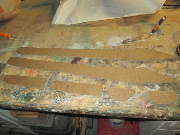 Primero, imprimir las tres páginas de mi plantilla a continuación.  Localizar todas las piezas en mi plantilla en una hoja del tablero del MDF que era 1/8 de pulgada de grosor.  Una vez que todos se trazaron, recorto en mi sierra.  Dio todas las piezas un lijado ligero.  También corté otro mango de dos piezas.  Realmente no planeo hacer otro mango de dos piezas pero hice algunos cambios de último minuto a la plantilla y pongo allí. Entonces cortar la sección amarilla de la pieza de hoja mango en mi plantilla de trazar sobre el tablero y recortar dos veces.