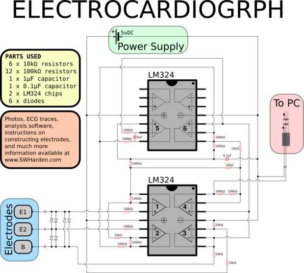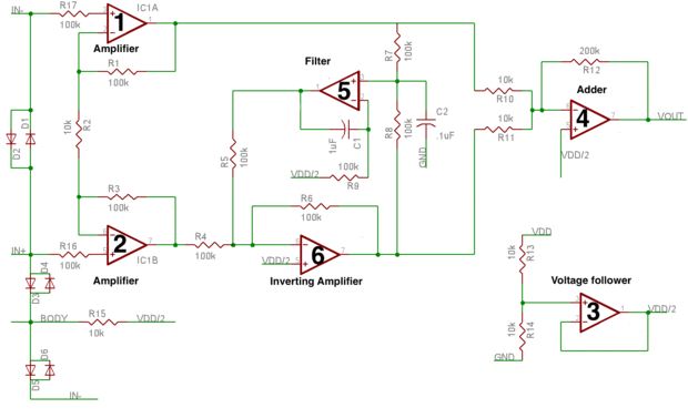 La resistencia de 200 k se puede construir usando dos resistencias de k 100 en serie (uno junto al otro). Diodos en cada entrada para disminuir el riesgo de choque. Haciendo esto, la tensión máxima entre cualquier dos electrodos será .7V. Esto es mucho mayor que la señal del corazón, así que no afecta a ningún otro rendimiento.