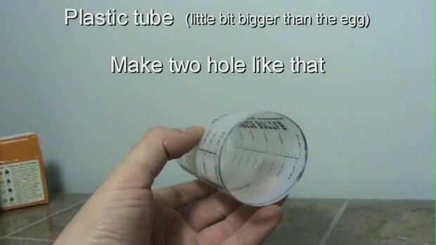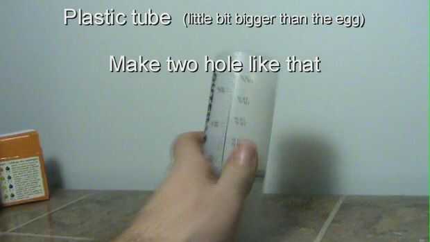tomar un tubo de plástico con un diámetro un poco más grande que el huevo. Hacer el agujero más grande de 2 hole.a para el huevo y el agujero más pequeño para el palillo del compresor de aire.
