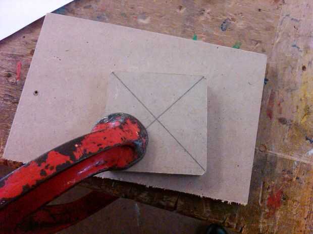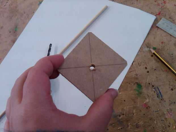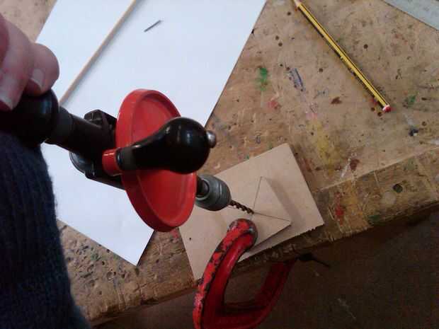 Una vez que la espira se corta y lija, necesita perforar el centro. Para asegurarse de que mi taladro era central, dibujé líneas diagonales de esquina a esquina, creando una cruz en el centro de la pieza. Luego sujeta la pieza de madera para una mesa con un trozo de material de desecho debajo de ella y perforado a través de la espira usando un taladro de mano.