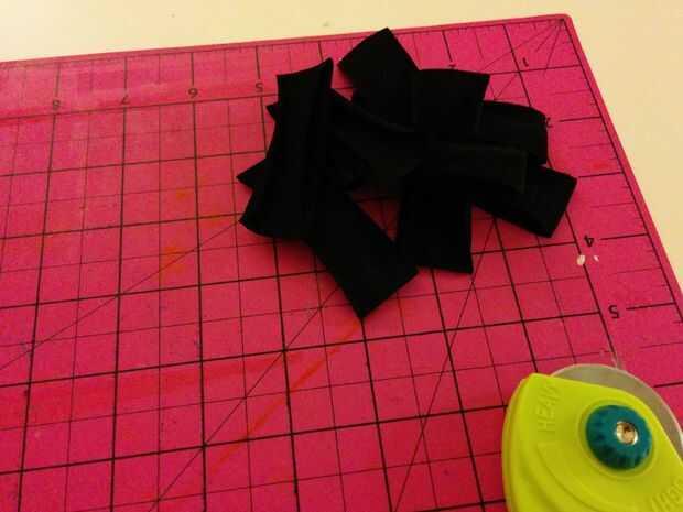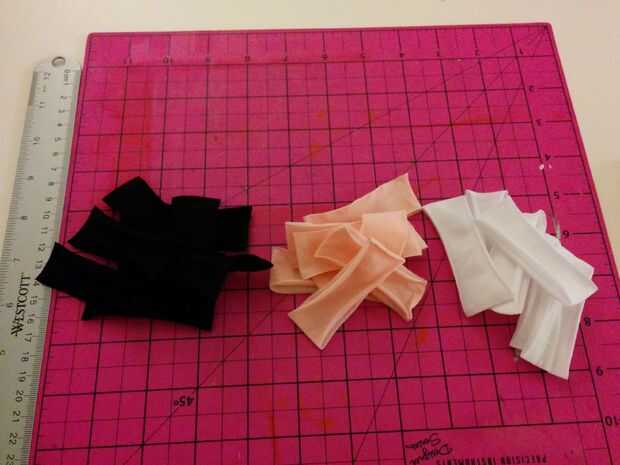 Una pierna de medias me dio exactamente ocho tiras de 1". Para este tutorial que sólo corté una pierna de medias por color, así que en total tengo 24 lazos para el cabello de tres patas.