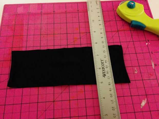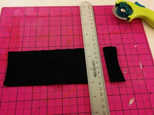 Coloque las piernas de modo que las tapas son a lo largo en de las líneas de la regla en la estera. Use la regla de metal para marcar la línea recta en el ancho deseado (para mi fue 1"). Corte a lo largo de la regla de metal con el cortador rotatorio. Mantenga las tiras del corte hasta que haya alcanzado el final de las medias. Su última pieza puede o no ser del mismo tamaño de los otros. Si es así, puede descartar el final uno, o sólo tiene un lazo de pelo ligeramente más estrecho.