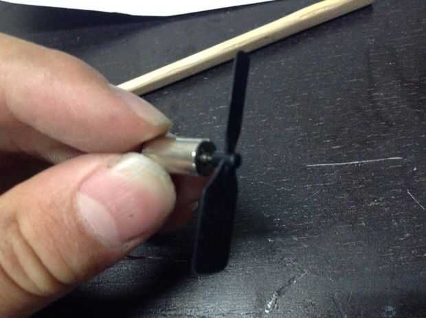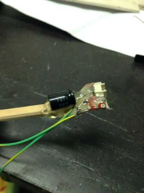 Pegar el conjunto condensador a la varilla de pasador con una cantidad generosa de su pegamento favorito. Pegar un clip en la parte delantera, un gran trabajo de madera de pequeña clavija de madera (no usar pinza cocodrilo! Es demasiado pesado! Yo sólo había grabado lo contrario). Enrolle los cables alrededor del marco para donde el motor será o del hilo de rosca a través de si es hueca. Poner la hélice del motor.