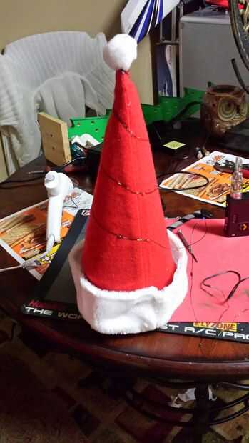 Ahora quieres tomar alguna espuma o periódico y cosas dentro del sombrero que llenar. Créeme que esto hace envolver las luces alrededor de mucho más fácil. Comencé en la parte superior del sombrero y envuelto mi camino hacia abajo. Quiere pegar las luces en la costura para que se vea mejor. Así que cada costura en para asegurar el alambre con un poco de pegamento caliente y es bueno. Ahora al llegar a la parte inferior que desea envolver alrededor del borde del sombrero y asegúrese de que termina en la parte posterior.