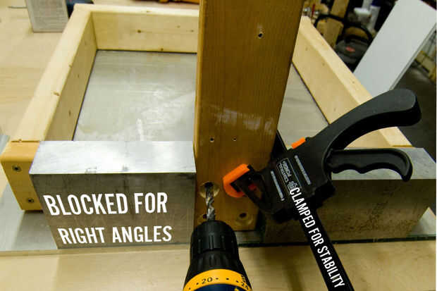 Usé las abrazaderas herramientas de carga de puerto para mantener la columna en la base y utiliza los agujeros en la base como plantilla para taladrar. Esto asegura que todo se alinea perfectamente y que la columna es recta.