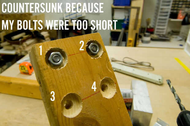 Simplemente mide 4 agujeros y los perforados. Es necesario avellanar los agujeros para los pernos de mi porque mis pernos eran demasiado cortos. Si había comprado los pernos nuevos en lugar de tirar de la basura, esto habría sido innecesario. Puesto que ya he recogido toneladas de pernos, valió la pena el pequeño amout de esfuerzo para avellanar, y me salvó otro viaje a la ferretería.