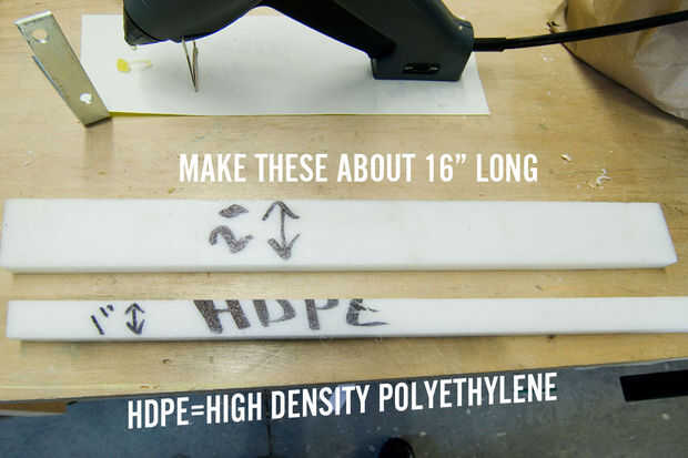 Mendigar, pedir prestado, encontrar o robar algún polietileno de alta densidad (plástico del tablero de corte). Usted no tiene que utilizar polietileno de alta densidad (en mi máquina primera utilicé ángulo de aluminio) pero he encontrado que funciona realmente bien. También encontré en el contenedor de basura de una tienda de plásticos. Polietileno de alta densidad se utiliza para hacer tablas personalizadas, por lo que a menudo hay excesos atajos disponibles por muy poco dinero. También simplemente puede comprar una tabla de cortar - tiendas de segunda mano están llenos de ellos. Cortar dos tiras. Elegí mi cortar dos tiras, que son 1 x 16" y 2 x 16". Estos sólo pasó a ser de tamaños convenientes. Es el más corto puede hacerlos 9", y el más delgado sería aproximadamente 1/2".