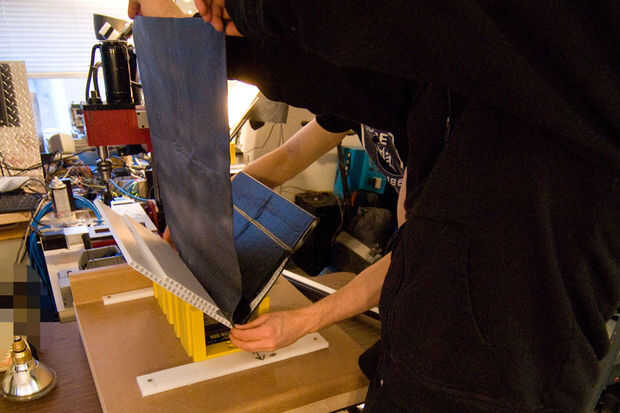 Este paso es más lento que el difícil, pero he incluido algunas imágenes para ayudar a guiarle. También me ayuda a tener un amigo para ayudar a manipular el material. La idea básica es utilizar pegamento de aerosol (por favor uso spray buena cola como a 3 M Super 74 o 77) para adherir el revestimiento de la caja de herramientas a lo VST.