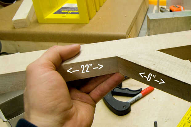 MiniStep 1. Cortar la madera. Corté la madera a 22" de largo y luego usar mi caja de ingletes, corté un soporte angular de 6" de largo. A los jodidos. Que no estaban perfectamente rectos, la madera original fue deformada. Sin embargo, no importaba porque este diseño es resistente a errores.