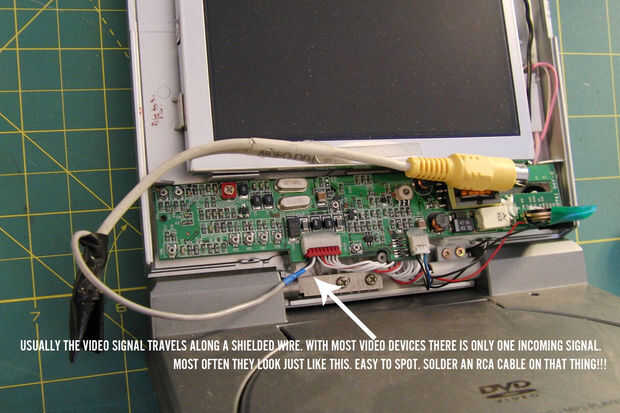 Corte el conductor central mientras el dispositivo está encendido y mostrando el "ápice" comience la pantalla. Si la pantalla se pone negra pero no apague, encontraste el cable de video. Este enfoque simplista ha trabajado para mí con muchos dispositivos, simplemente busque un alambre entrante blindado que parece plausible y cortar para ver si desaparece la imagen en pantalla. Crudo, pero efectivo.