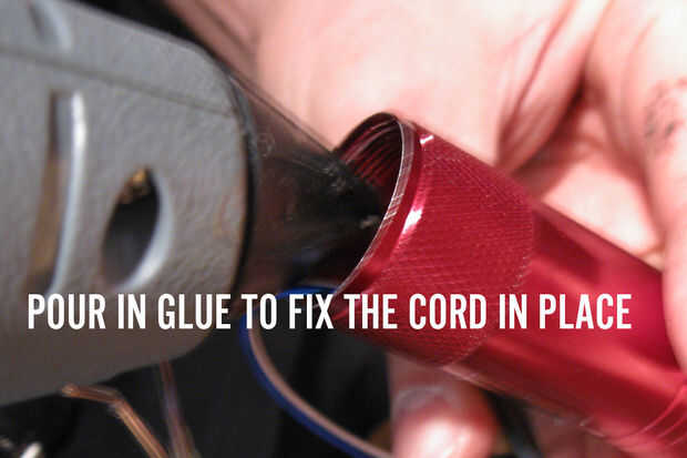 Aplicar abundante pegamento caliente a la cuerda de la bobina entrante para fijarlo en su lugar.