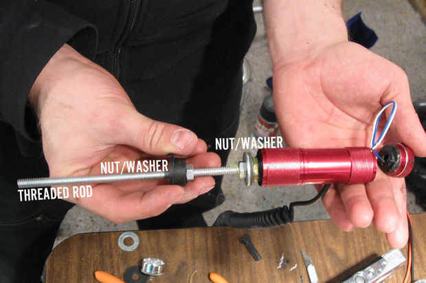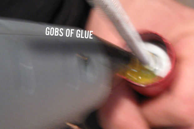 La idea es pegar la varilla en el centro de la linterna, por lo que sale del lado izquierdo. No tiene que hacer girar - todo lo contrario. Una vez que tengas tu montaje listo, introdúzcalo en la linterna y fijarlo con un montón de pegamento caliente. No seas tímido con ella. Me ha pasado que poco agradable de plástico negro que selló el final, pero podría utilizar otra lavadora o nada en absoluto.