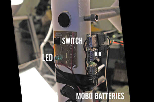El primer interruptor que hice fue totalmente reciclado. Tenía un interruptor y llevado de una impresora vieja, dos Motherboard, Tarjeta madre memoria baterías de respaldo (rescatadas de malas motherboards) en serie y las tripas de un hub USB roto. Este diseño era malo por dos razones. Uno, fue montado en el mismo brazo que una de las cámaras, por lo que cada vez que tomé una foto disturba un poco la posición de la cámara. En segundo lugar, las baterías de Motherboard, Tarjeta madre no son baratos o fáciles de encontrar si necesitan ser reemplazados. Finalmente, este circuito era un fastidio porque el LED se ilumina raramente. Todavía no sé por qué.